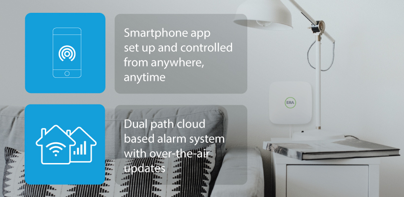 System requirements: A compatible iPhone or Android device (minimum OS for Android and iOS – Android 7 & iOS11, ERA Protect app from iTunes or Google Play and an Internet Connection). For internet connectivity a spare Ethernet port (RJ45 connector) on your router is required. The ERA Protect Plus service required for use of pre-installed SIM card for SIM back up or SIM only mode.